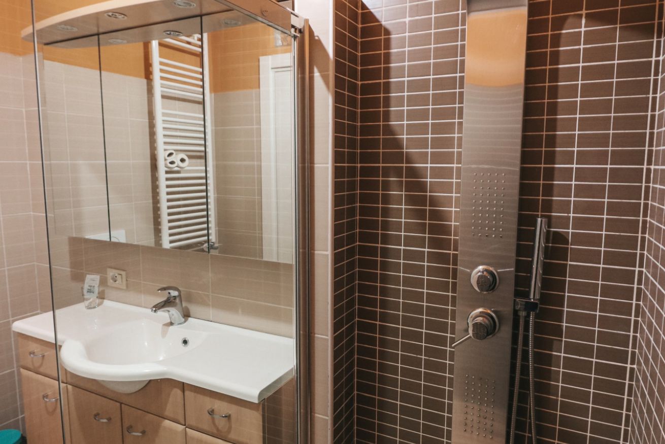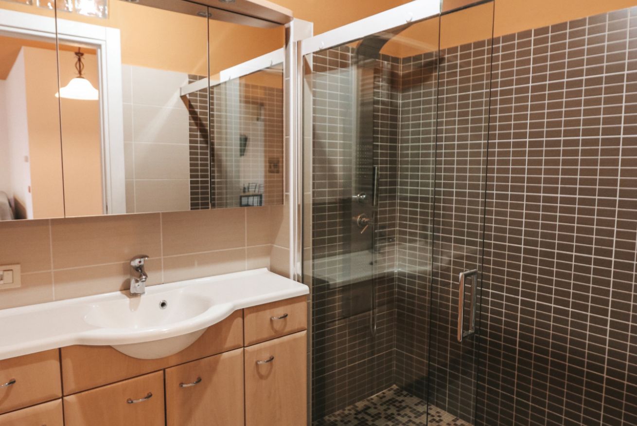 Bagno con doccia a filo pavimento.