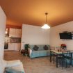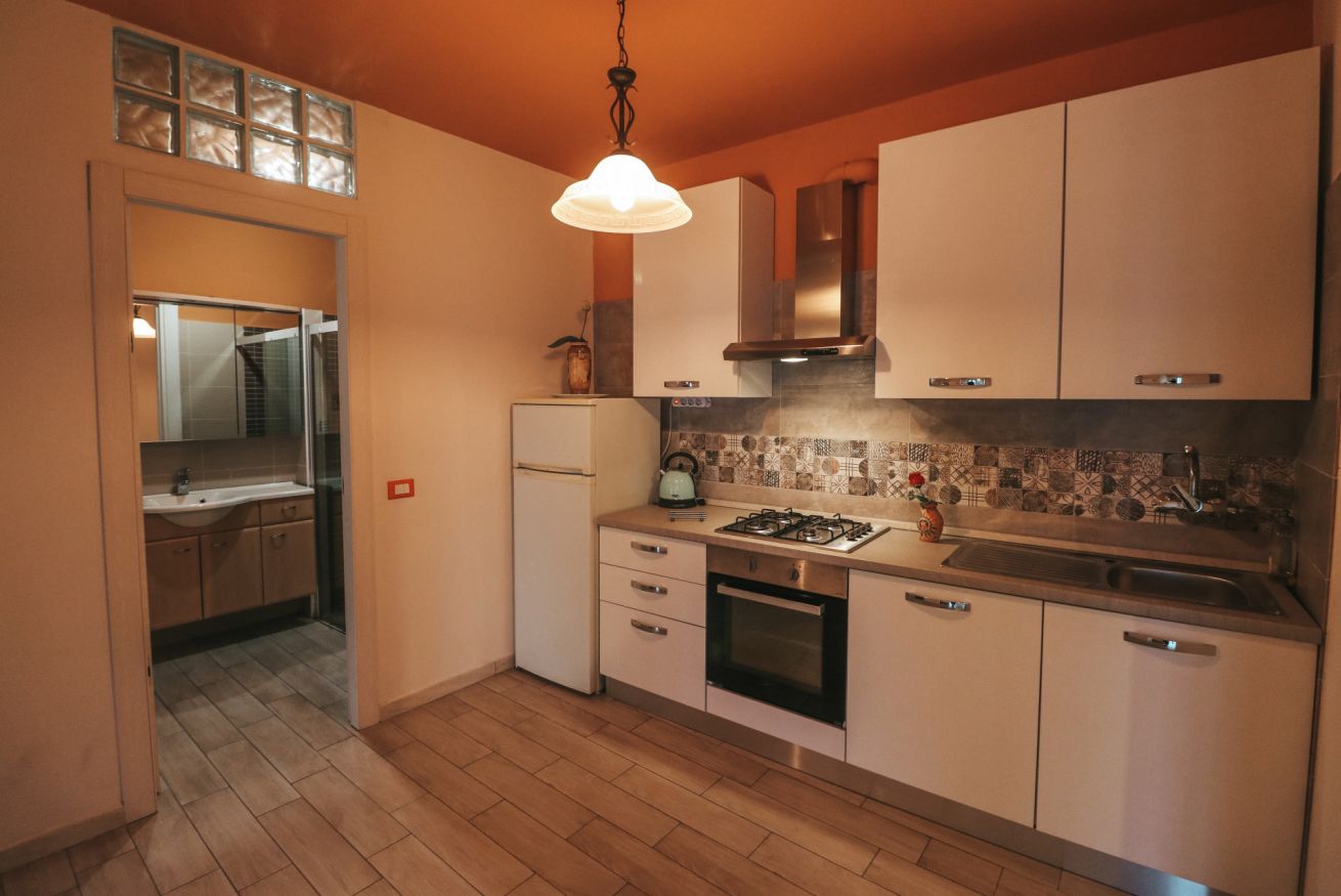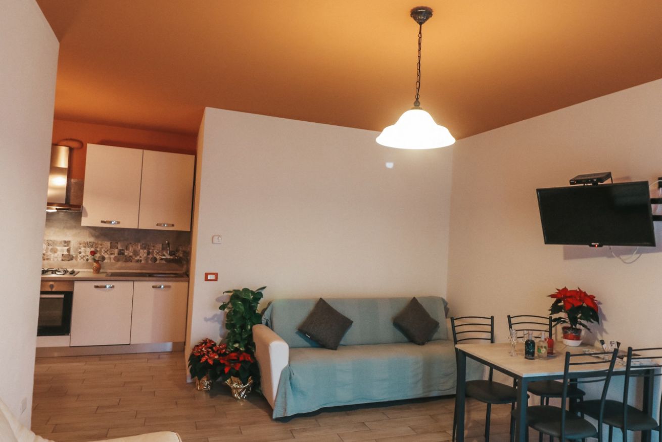 Grande soggiorno con 2 divani, camera da letto tripla, cucina completa di lavastoviglie, forno e frigorifero.